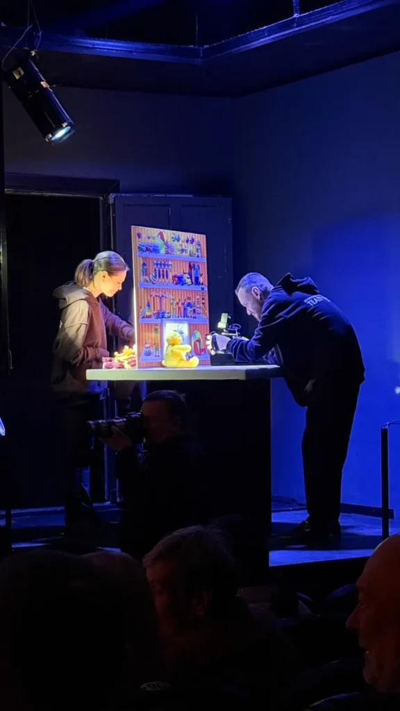 Как всегда неподражаемая актерская игра Натальи Кот-Кузьма, фишечки-пасхалки любимого режиссера, невероятные куклы, которые хочется бесконечно рассматривать, игра света, внушающие инсталляции и фирменный приём с двойным объемным сюжетом путём съемкой на камеру действий на второй мини-сцене.