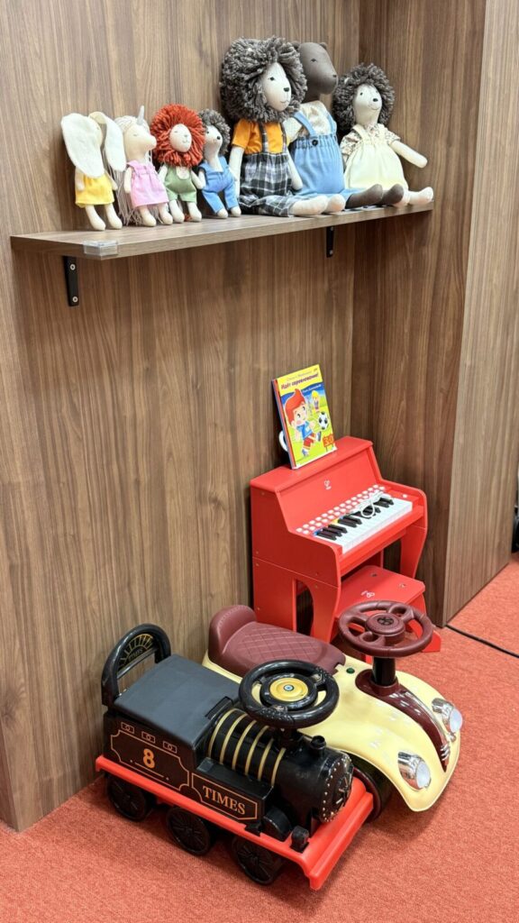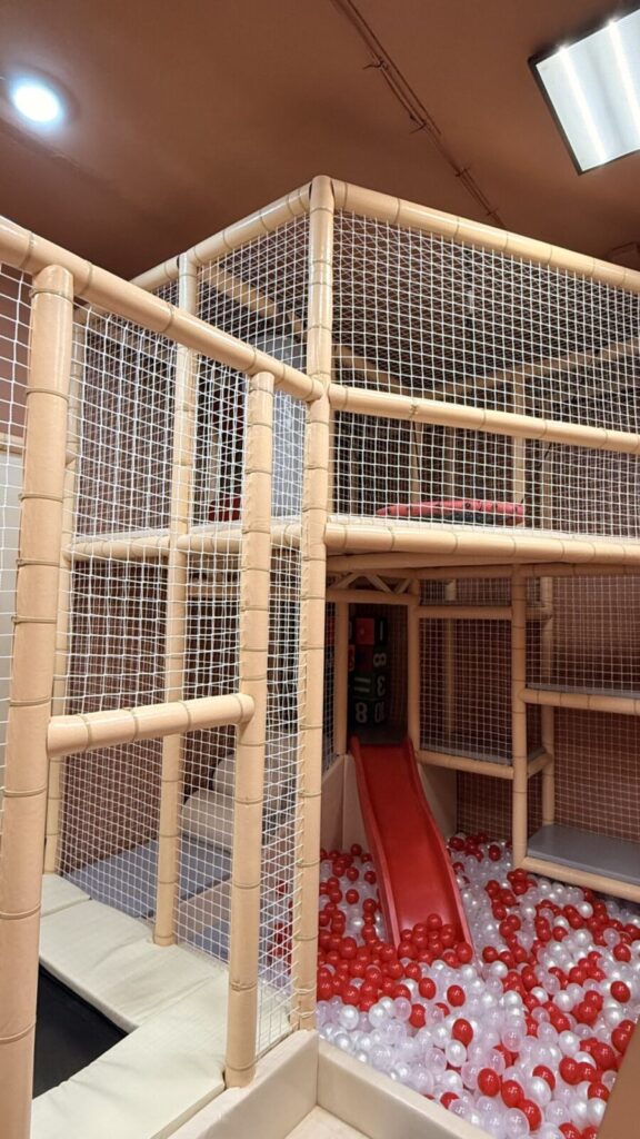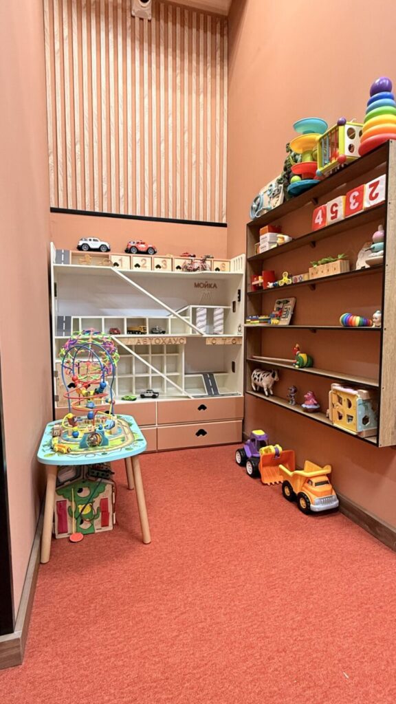 В меню обещают горячие супы, блинчики с начинками, пироги, обеденную домашнюю еду. Само пространство разделено на 2 комнаты: в первой уютная зона со столиками, барная стойка и всё для ролевых игр (кухня, куклы, детское кафе), во второй — лабиринт с горочкой и сухим бассейном.