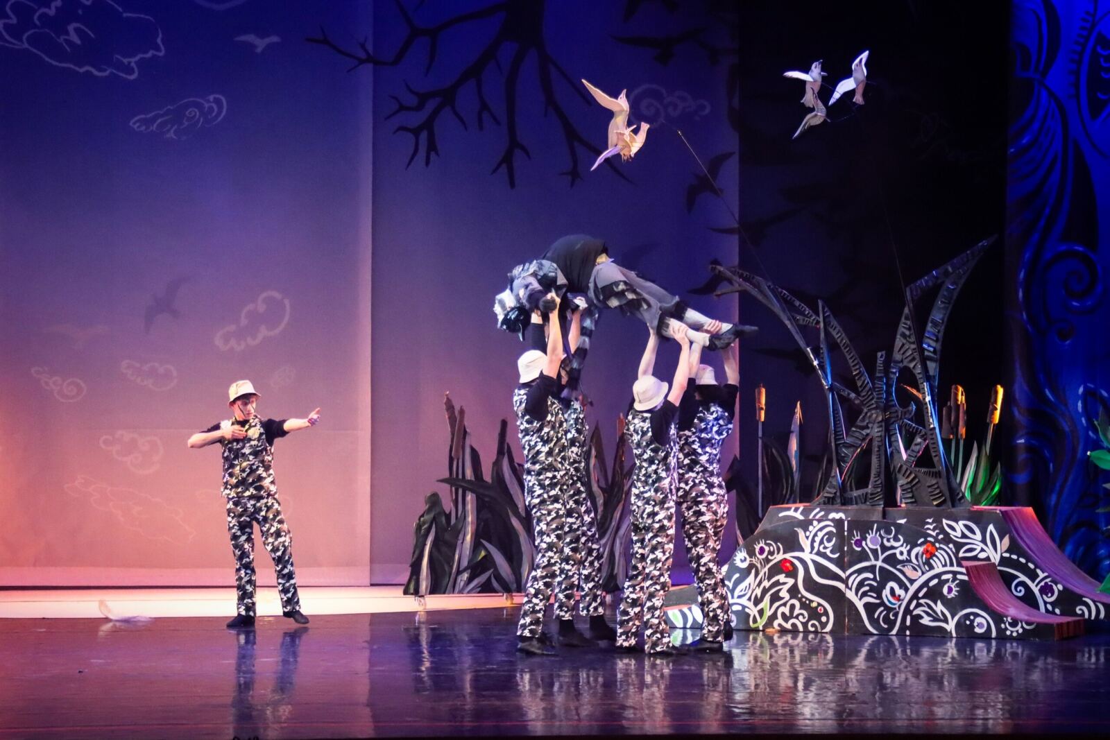 Рано утром мальчик Петя выходит на большую зелёную лужайку. На высоком дереве сидит его знакомая Птичка. Заметив Петю, она начинает радостно кружить со стаей птиц. Вслед за Петей появляется Утка. Неуклюжая птица направляется к пруду, чтобы поплавать с другими утками.
