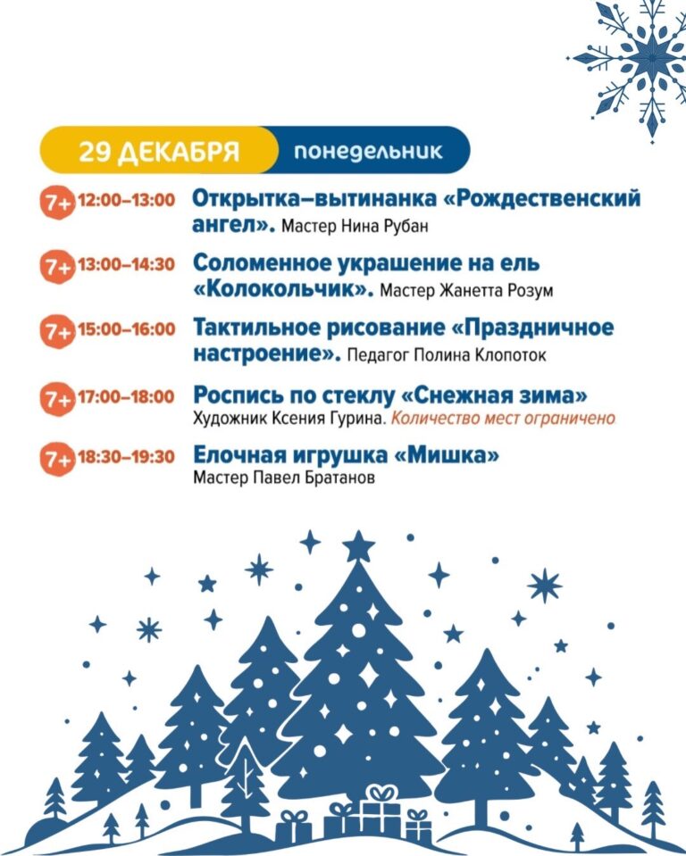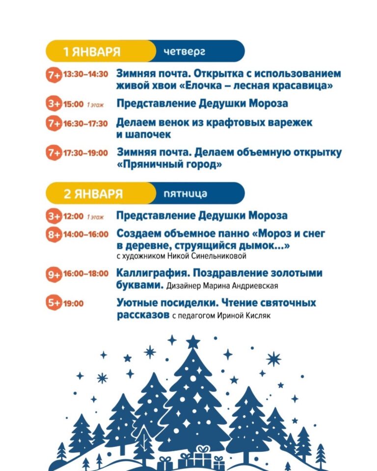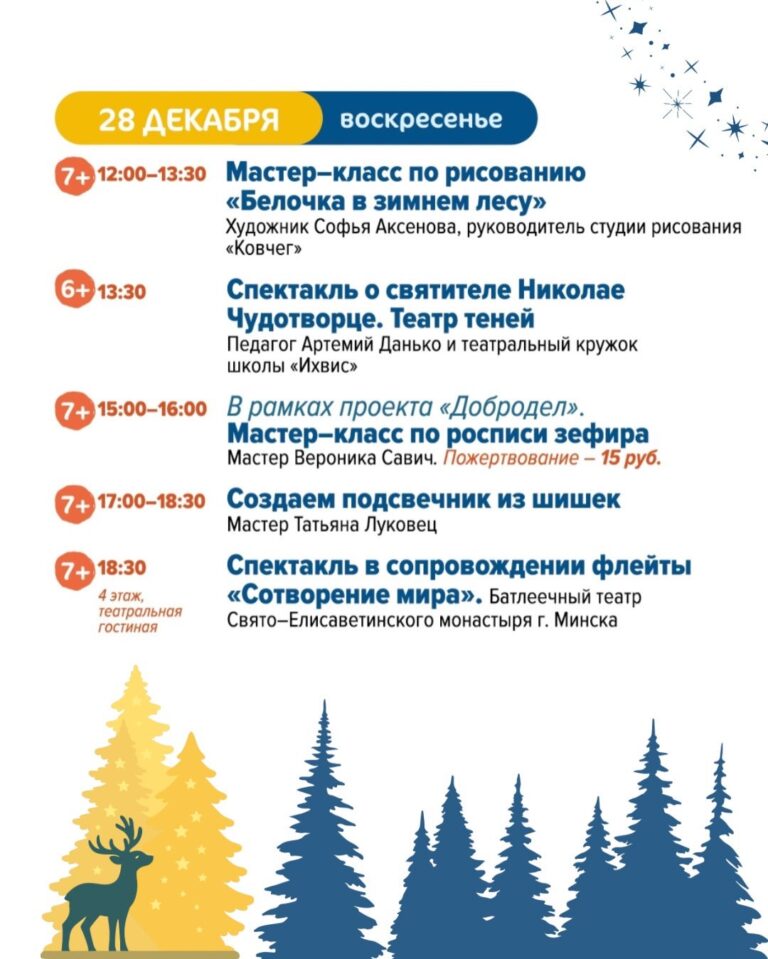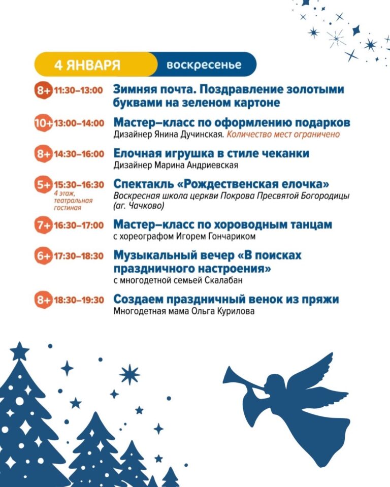 С 26 декабря по 6 января ежедневно вас ждут мастер-классы на тему зимнего творчества, спектакли батлейки и интерактивная экспозиция «Снежная королева» (4 этаж)
