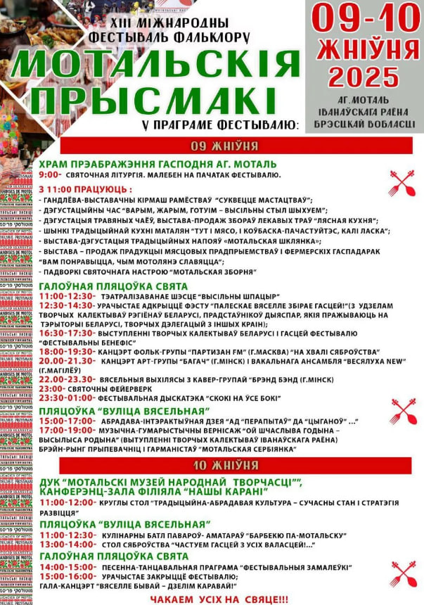Один из самых колоритных и вкусных праздников Беларуси — международный фестиваль фольклора и кулинарии «Мотальскія прысмакі» — пройдет в агрогородке Мотоль Ивановского района 9 и 10 августа.