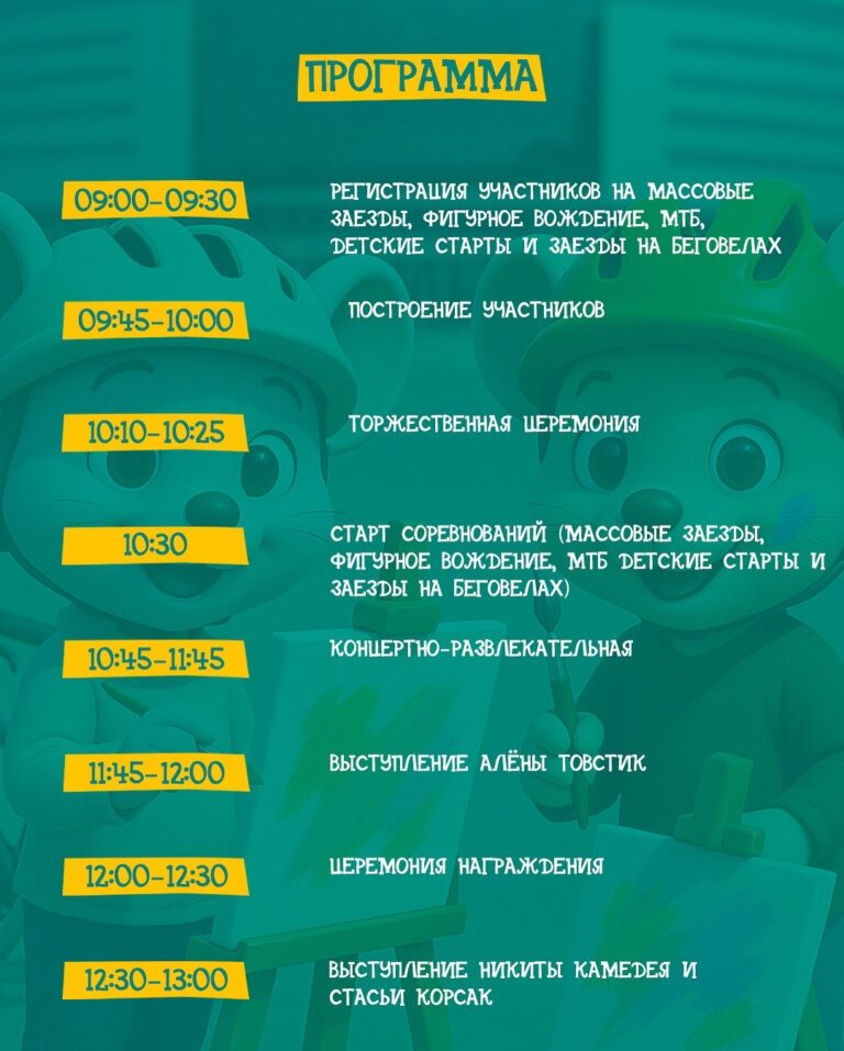 9:00 — 9:30 — Регистрация участников на массовые заезды, фигурное вождение, МТБ, детские старты и заезды на беговелах
