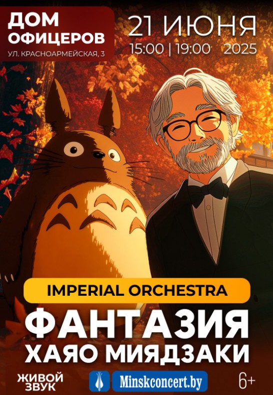 В исполнении оркестра Imperial Orchestra прозвучат саундтреки из самых известных анимационных фильмов автора. Более 30 виртуозов, авторские аранжировки и уникальное световое шоу отправят зрителя в диковинные красочные миры Миядзаки.