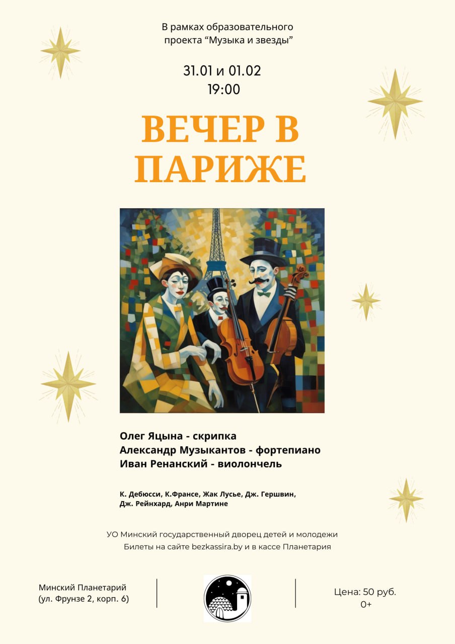 31 января и 1 февраля в 19:00 в рамках образовательной программы минского Планетария «Музыка и звезды» мы предлагаем вам погрузиться в пестрые огни Парижа!