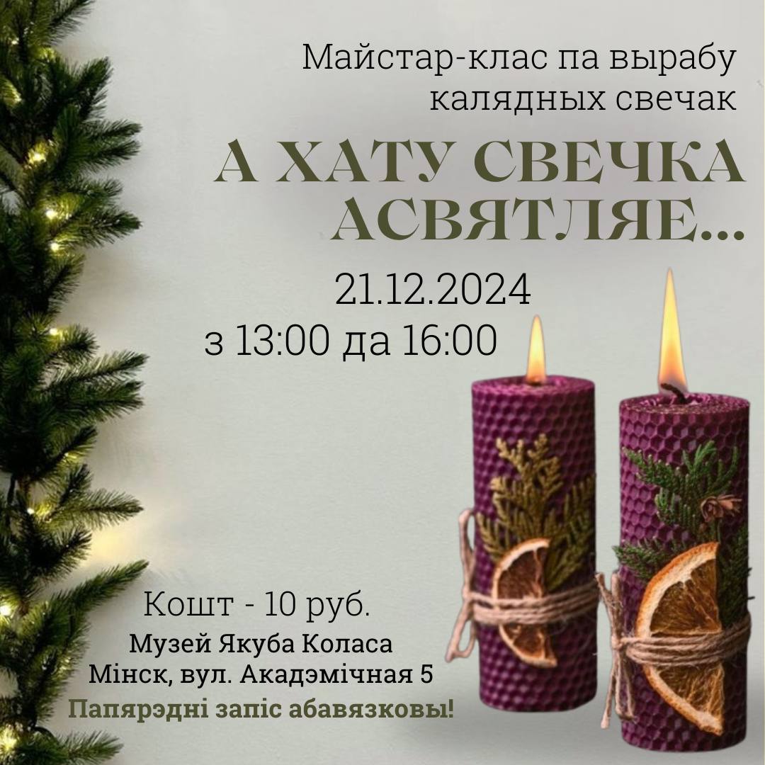 Сябры! 21 снежня у музеі Якуба Коласа пройдзе майстар-клас па вырабу калядных свечак з вашчыны!