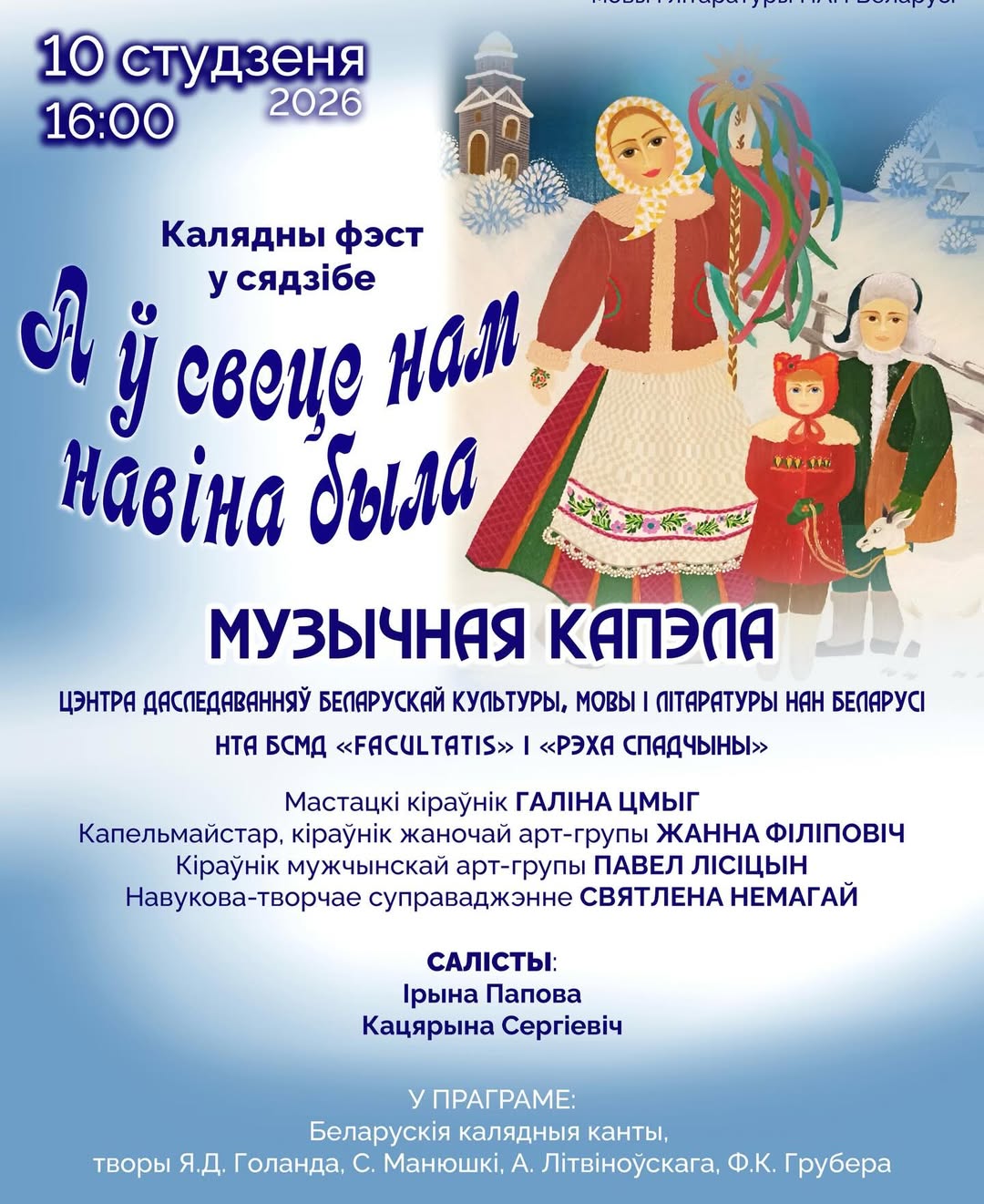 Запрашаем Вас знайсці адказ на гэтае пытанне, наведаўшы новую інтэрактыўную праграму «Калядны фэст у сядзібе «А ў свеце нам навіна была» Музычнай капэлы Цэнтра даследаванняў беларускай культуры, мовы і літаратуры Нацыянальнай акадэмii навук Беларусі. Вы зможаце не толькі акунуцца ў атмасферу зімовых святаў, вывучыць з намі любімыя песні, але і паўдзельнічаць у яркіх калядных абрадах.