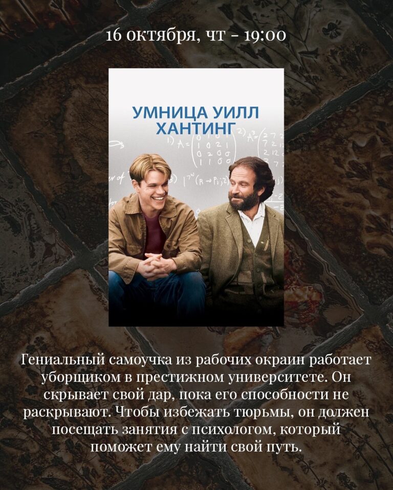 19:00 — Умница Уилл Хантинг (1997), драма, мелодрама, 18+