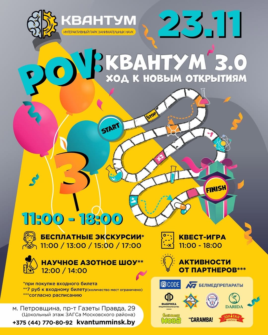 Мы с огромной радостью объявляем, что 23 ноября нашему любимому Парку наук «Квантум» исполняется 3 года! Это невероятное путешествие в мир знаний, экспериментов и удивительных открытий, которое стало возможным благодаря вам!