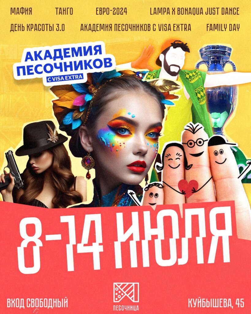 Песочники, афиша на 2 неделю июля! Смотрим ЕВРО-2024 полуфинал и финал, слушаем концерты OurVinyl Sessions на большом экране в пятницу танцуем вместе с LAMPA x BONAQUA JUST DANCE, а в субботу состоится яркое мероприятие День Красоты 3.0 Ждем вас!