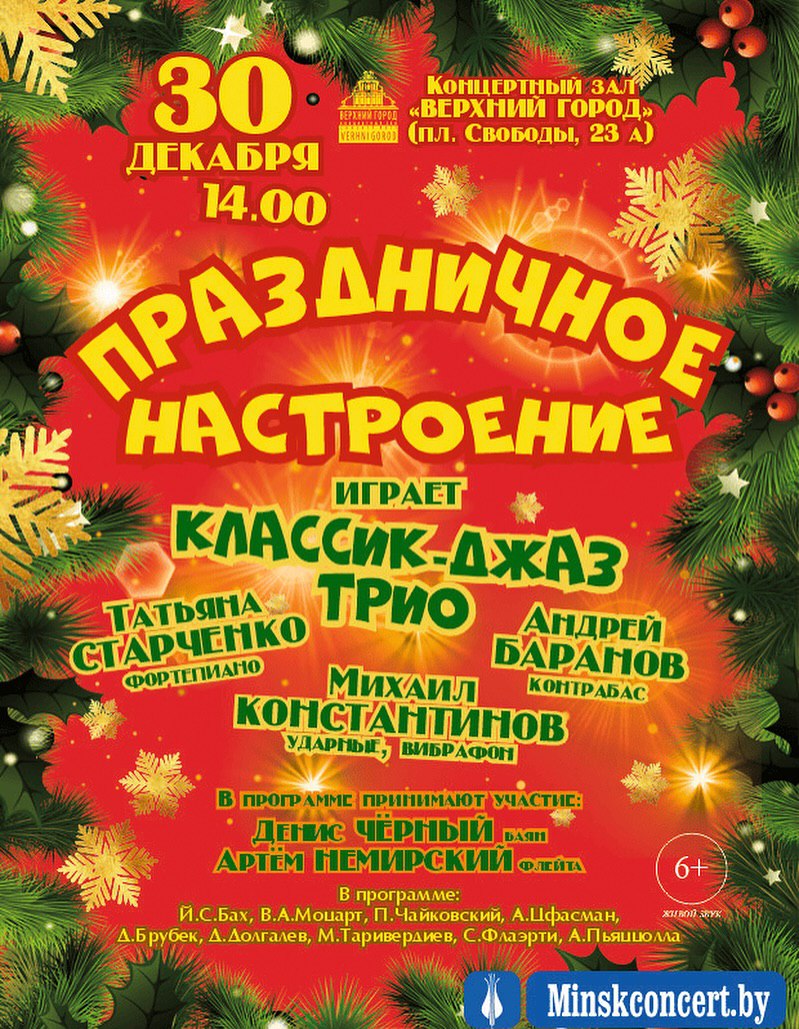 В исполнении Татьяны Старченко, Андрея Баранова и Михаила Константинова прозвучит любимая классика, джазовые стандарты, новогодние композиции.