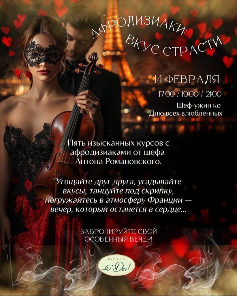 14 февраля ресторане о’Da приглашает вас на вечер, который соединяет изысканную гастрономию и магию афродизиаков. Шеф-повар Антон Романовский создал пять курсов, чтобы подарить вам незабываемое путешествие в мир вкуса и чувств.