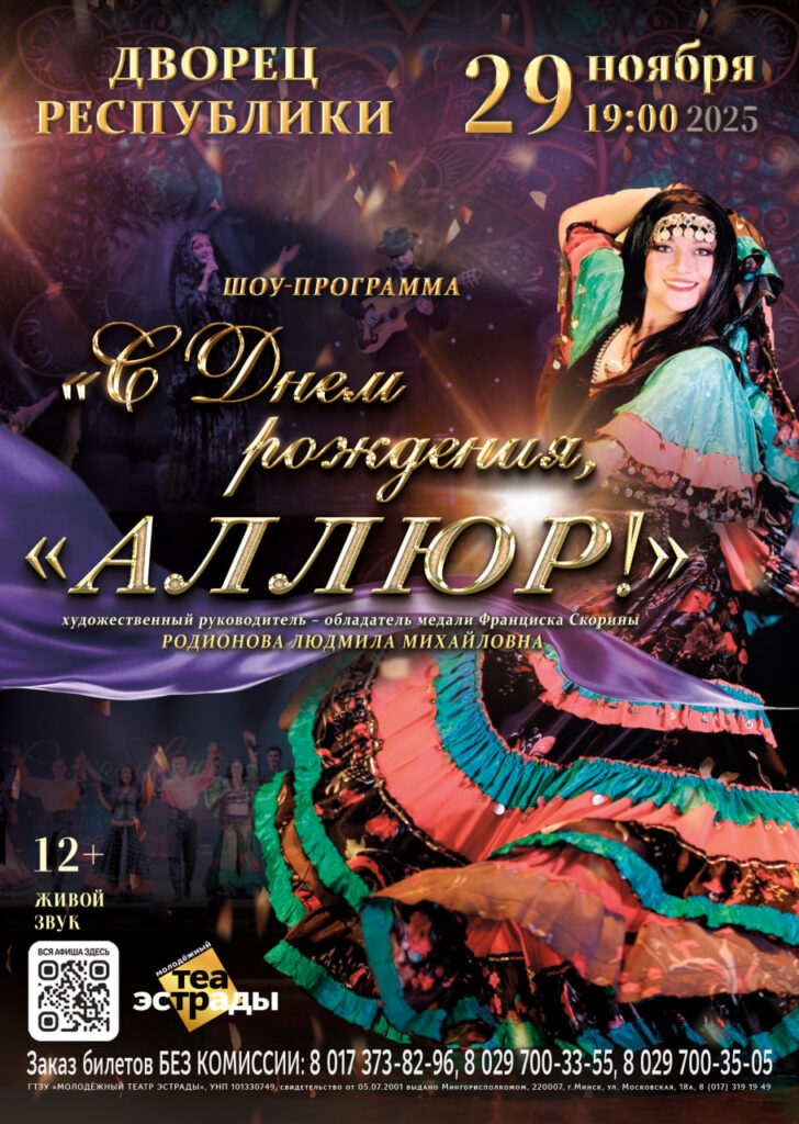 Концерты шоу «Аллюр» в Минске всегда являются одним из самых главных музыкальных событий столицы. Приходите получать истинное удовольствие от творчества талантливых артистов шоу «Аллюр» и Вы однозначно не пожалеете!