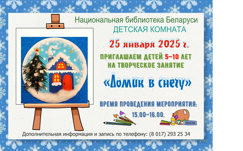 25 января детская комната приглашает детей 5–10 лет на творческое занятие «Домик в снегу» в смешанной технике.