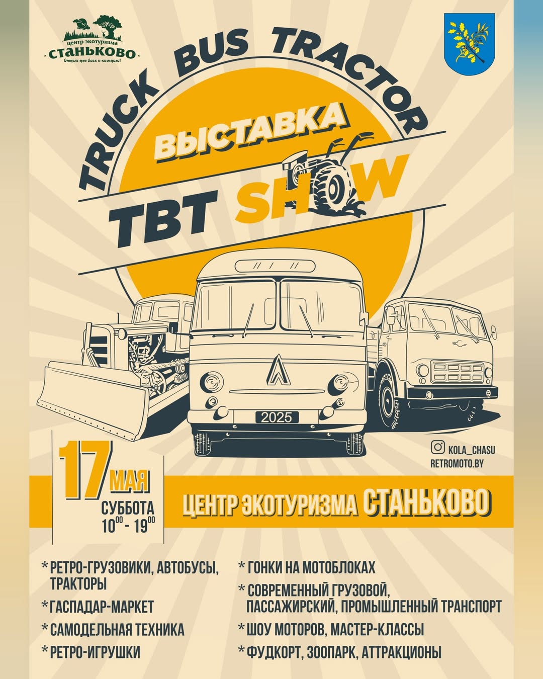 Самые большие ретрогрузовики, милейшие ретроавтобусы, симпатичные ретротракторы, удивительные тюнинг-проекты, впечатляющий современный транспорт, уникальная самодельная техника и Настоящий драйв — Гонки на мотоблоках! — всё это на одной площадке «TBT Show»!