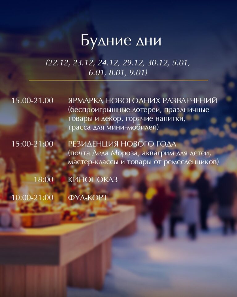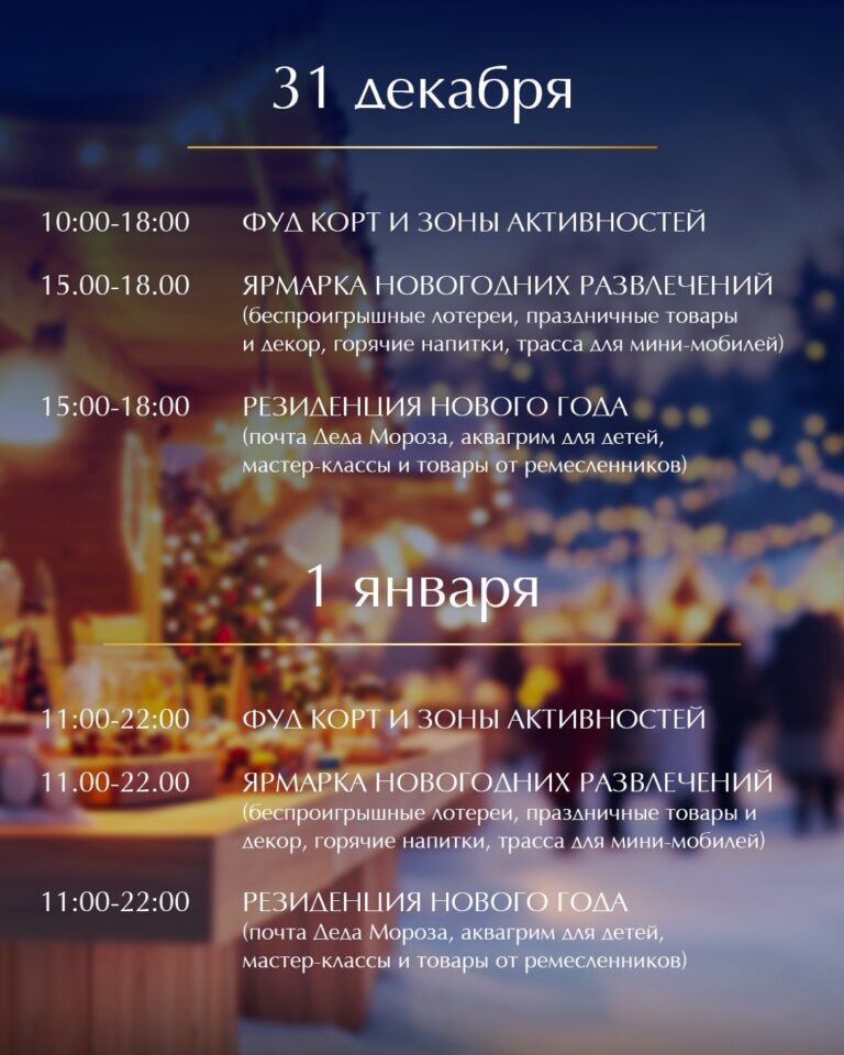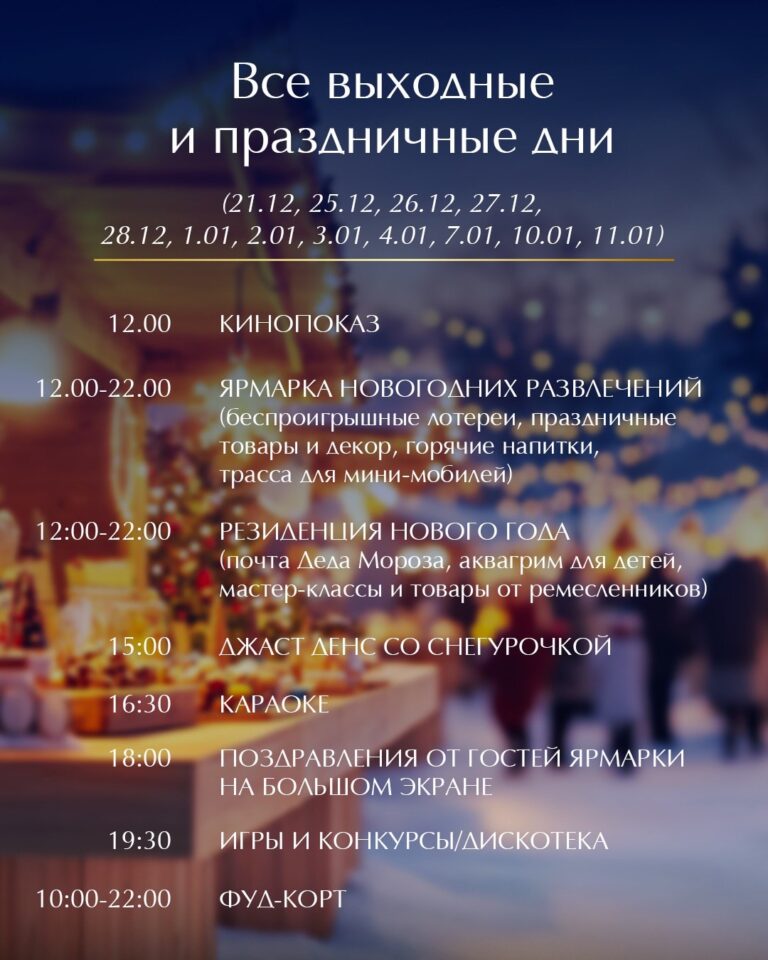 Вас ждёт Ярмарка новогодних развлечений с праздничными товарами и декором, тематические фотозоны, фуд-корт с горячими угощениями и напитками, а также разнообразные бесплатные активности для всех гостей.