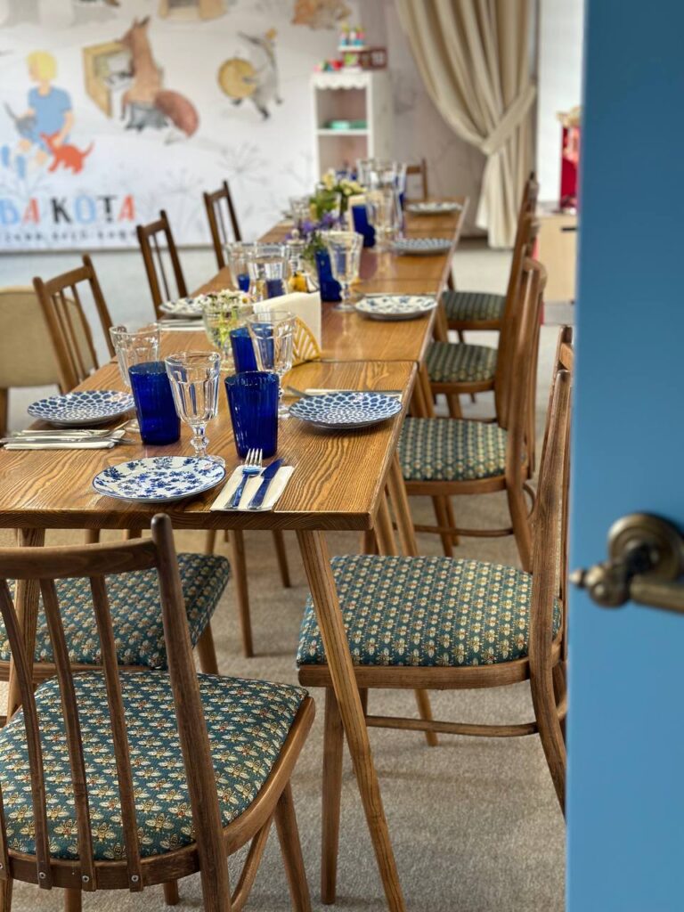 - Сервировка взрослых и детских столов нашей посудой. Вся посуда красиво сочетается между собой. Есть добавочная посуда для закусок и предоставляем тарелочки для десертов. Бокалы, стаканы, тарелки, плато, приборы, салфетки, вазочки с цветами, красивая мебель и стулья. Питьевая вода в графинах;