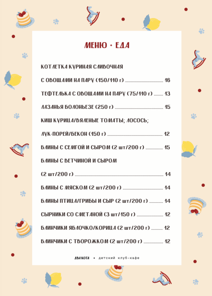 Вы можете заказать любую еду из ресторана или сервиса доставок. С радостью подскажем вам, где вкусно и удобно. Для детей рекомендуем заказать наше меню, если ребята любят простую домашнюю. Если хочется фастфуда, тогда лучше заказать его.