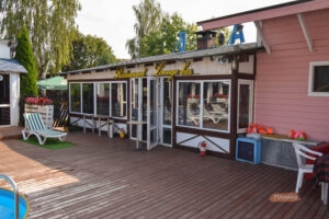 А заказать еду и напитки вы можете в кафе «Птичь» (мы, кстати, оценили детское меню и вкуснейший шашлык, когда праздновали тут на Степкин ДР). А можно забронировать заранее столики, переместиться после водных развлечений в кафе и устроиться в уютных беседках (есть даже с качелями!), в основном зале или на террасе.