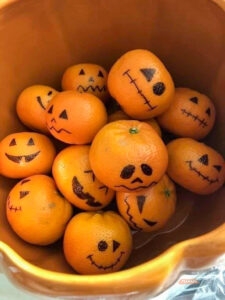 жуткие мандарины — нарисовать на мандаринах фломастерами разные мордочки;