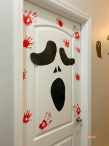 кровавые руки — раскрасить ладони красной гуашью и сделать отпечатки на бумаге. Когда краска полностью высохнет — расклеить по поверхностям;