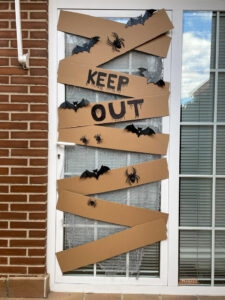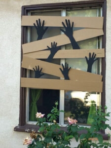 заколоченные окна — полоски коричневого картона наклеить на двусторонний скотч на оконные рамы. Добавить пауков, паутины или рук из чёрного картона;
