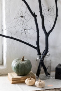 паутина в вазах — обвить ветки нитками, как паутиной и украсить паучками и бумажными летучими мышами;