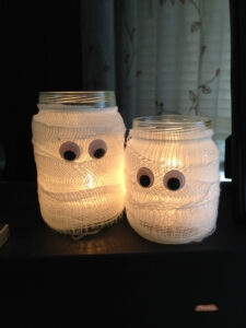 ужасающие банки — раскрасить стеклянные банки разного размера чёрной краской, но оставить «лица». Когда краска высохнет можно зажигать внутри свечу или маленькие гирлянды.