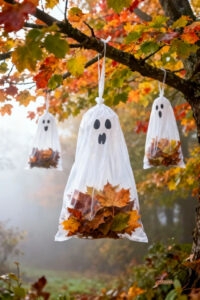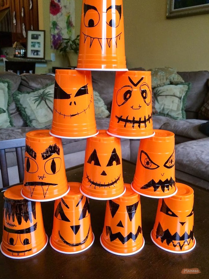 «Боулинг из привидений» — нарисовать на стаканчиках рожицы, собрать из них башню и сбивать ее мячиком из фольги;