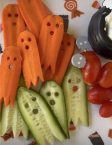 «овощные привидения» — на полосках огурца, морковки или перца вырезать лица привидений и подавать с хумусом, например;
