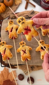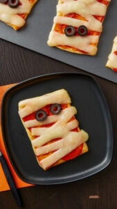 «слоеные мумии» — прямоугольные кусочки слоеного теста смазать томатным соусом, выложить ветчину или пепперони, сверху накрыть полосками моцареллы и сделать глаза из черных оливок. Запечь в духовке до готовности;