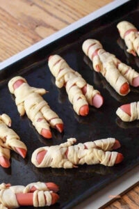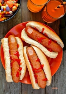 хот-доги с отрубленными пальцами — с одной стороны сосиски срезать кусочки, похожие на ноготь, и сделать надрезы. Уложить «палец» в булочку и добавить крови из кетчупа😅;