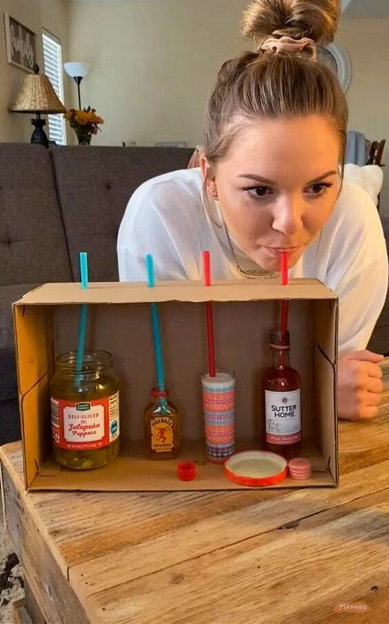 «Угадай напиток» — в обувную коробку, например, поставить стаканчики с разными напитками (томатный сок, огуречный рассол, молоко, сок, детская пюрешка из брокколи), закрыть крышкой сверху и проделать отверстия для трубочек. Каждый выбирает по 1 трубочке, пробует, но старается не показывать эмоции. Когда все участники продегустируют свой напиток, высказывают своё предположение, что за напиток попался;