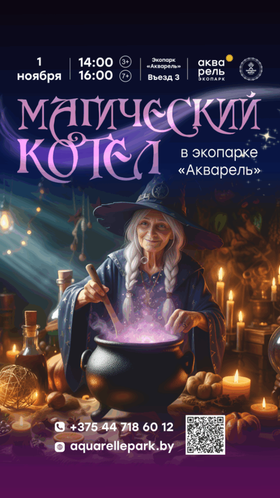 Магический котел (экопарк «Акварель», 3+) — развлекательная программа для детей с полётами на метле, зельеварением и прочими хэллоунскими развлечениями;