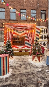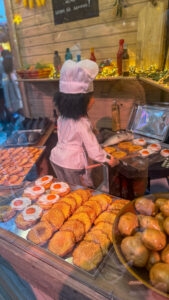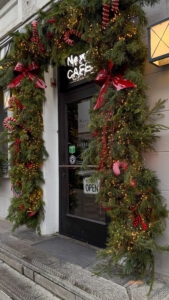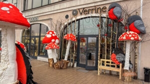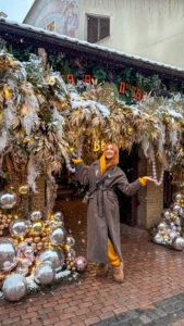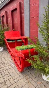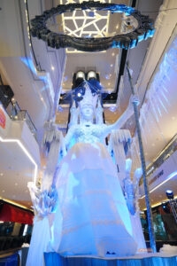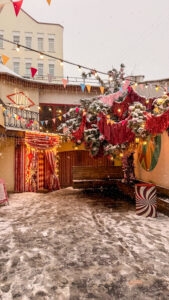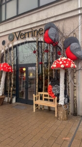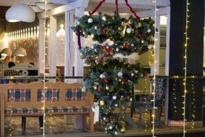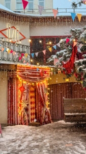 В зоне кафетерия установлена небольшая фотозона с красивым троном и нарядной лесной красавицей. После обязательно закажите чашечку горячего шоколада и устройтесь у окошка — вид волшебный на рождественскую ярмарку через дорогу.