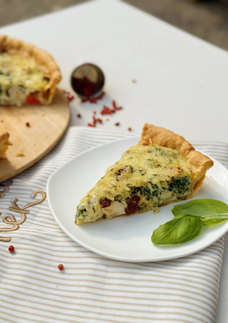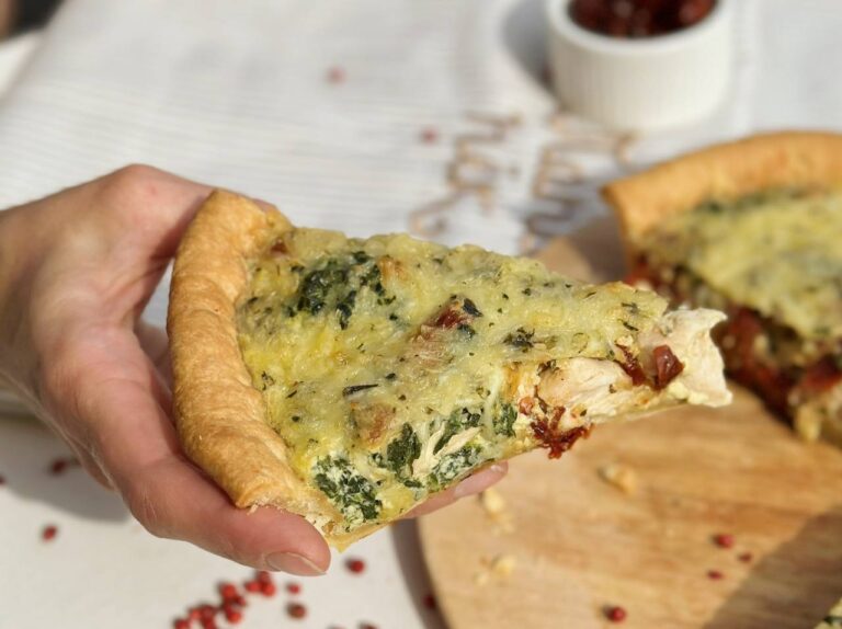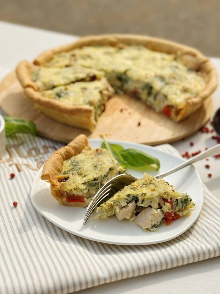 Пшеничная мука, сливочное масло, творог, сахар, соль, курочка филе, шпинат, свежий перец, вяленые томаты, базилик, масло подсолнечника, сыр тильзитер, сливки, яйца, перец.