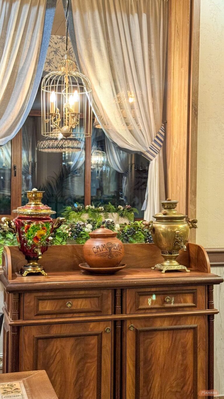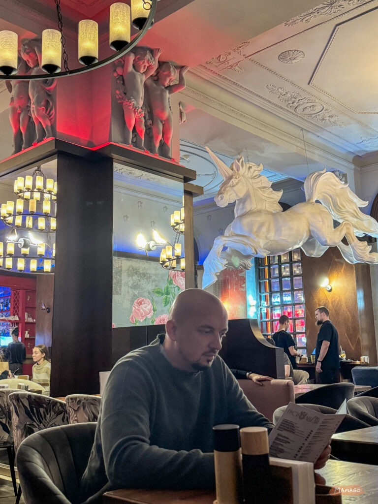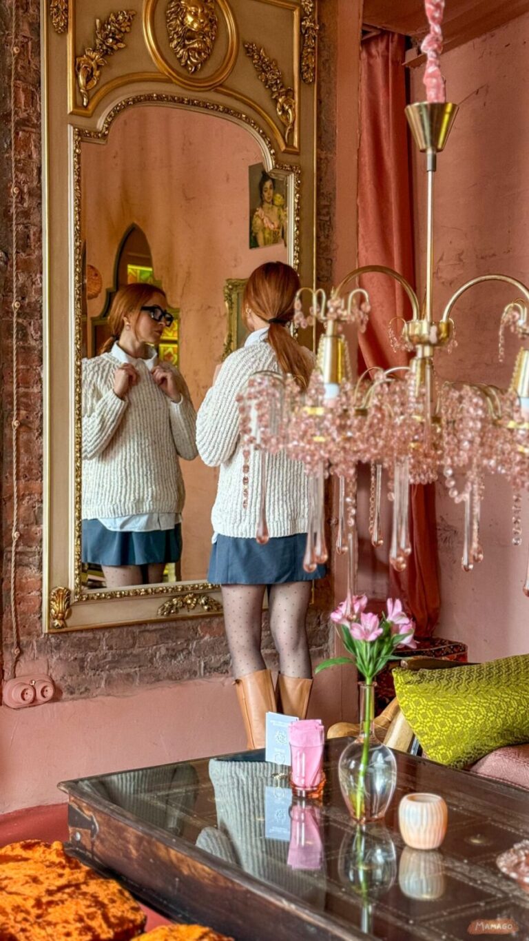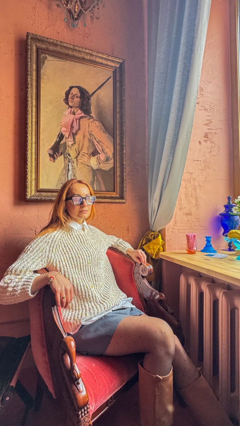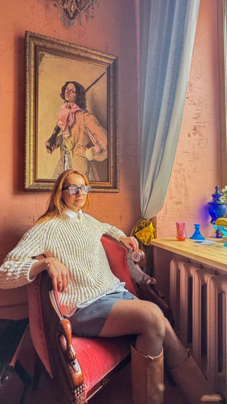 Кафе на 2-х этажах открыла известная блогер Рада Русских. На входе у вас примут заказ (без него наверх никак) и проведут экскурсию по трём залам, уставленным винтажными предметами интерьера, антиквариатом, роскошными вещицами. Ощущение, что попадаешь в музей гедонизма. Мозг моментально расслабляется и выключает мыслемешалку, созерцая красоту и рассматривая каждую деталь: ножки стола в виде сфинкса, хрустальную изумрудную люстру, золотую вышивку на подушке… А «туалетные комнаты» — отдельный вид искусства. Во французском зале множество изысканных аксессуаров и сервиза. В восточном зале проходят чаепития и вход сюда только в нослчках. В румынском зале стены увешаны портретами наших предков «вампиров» и тут же проходят тематические балы гедонистов-вампиров с участием хозяйки Рады.