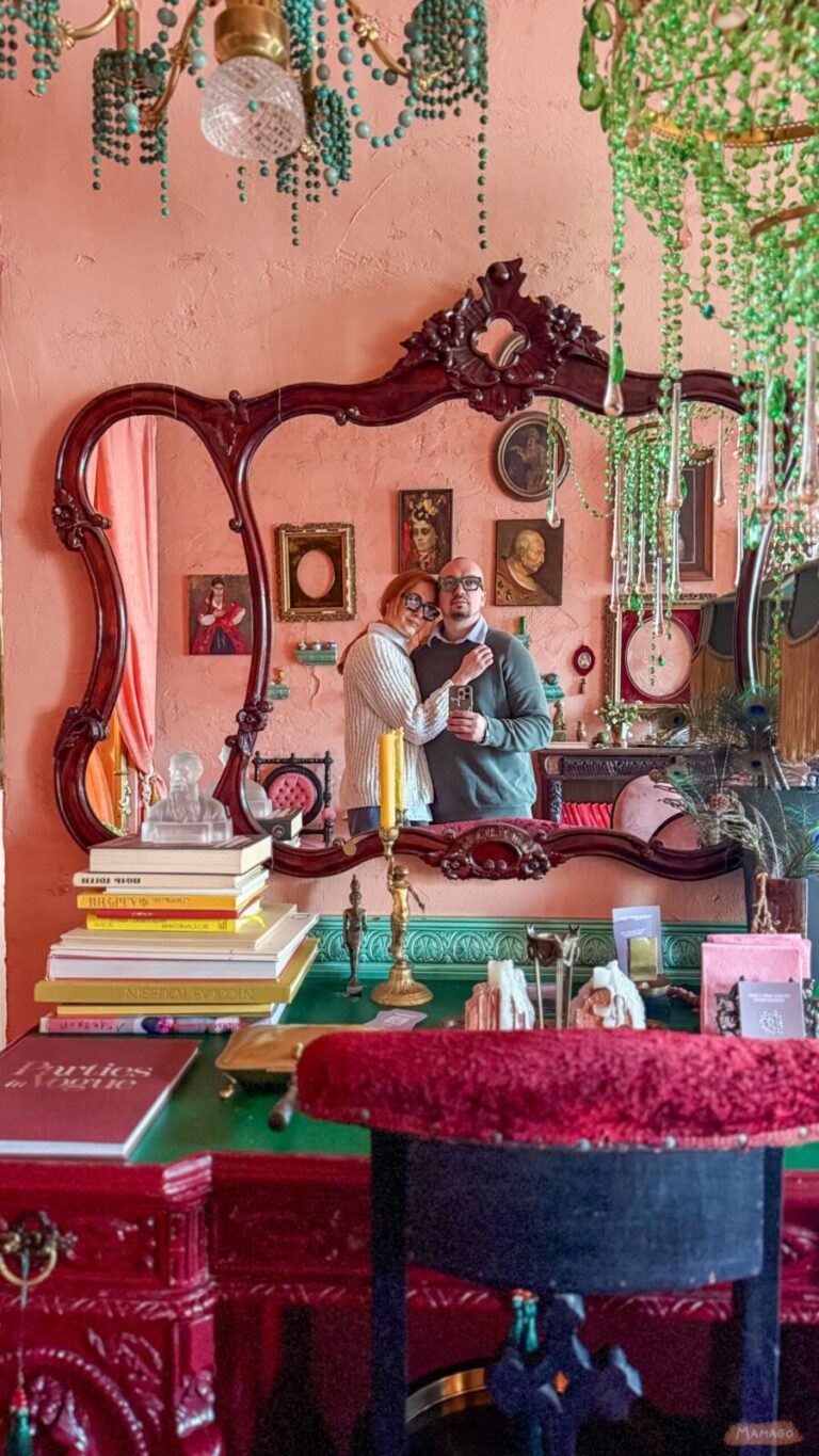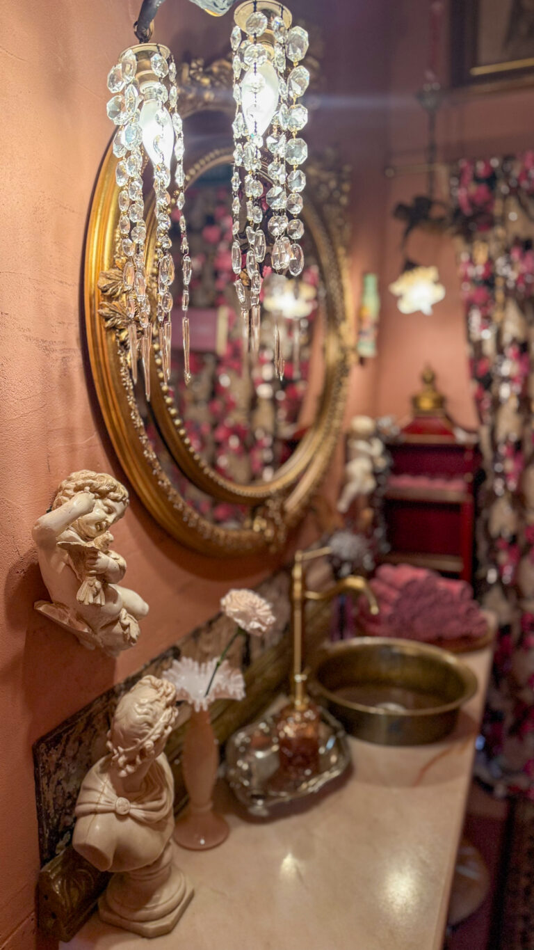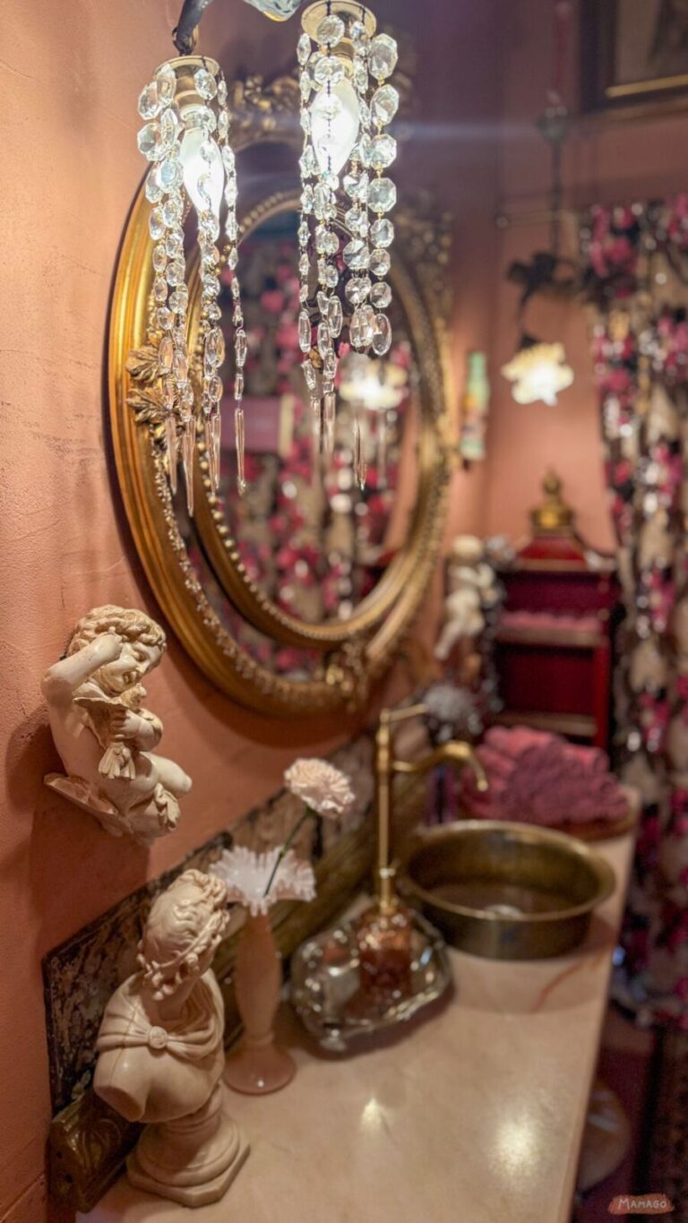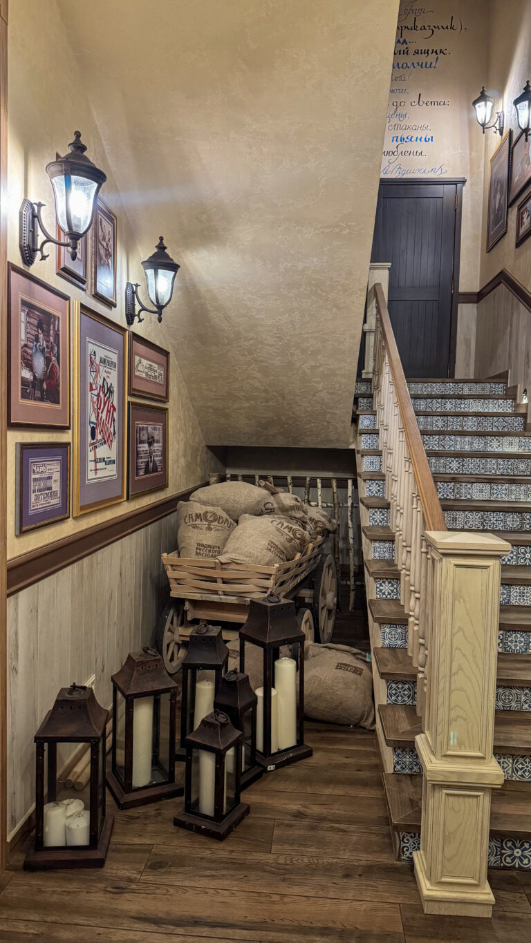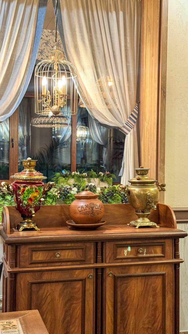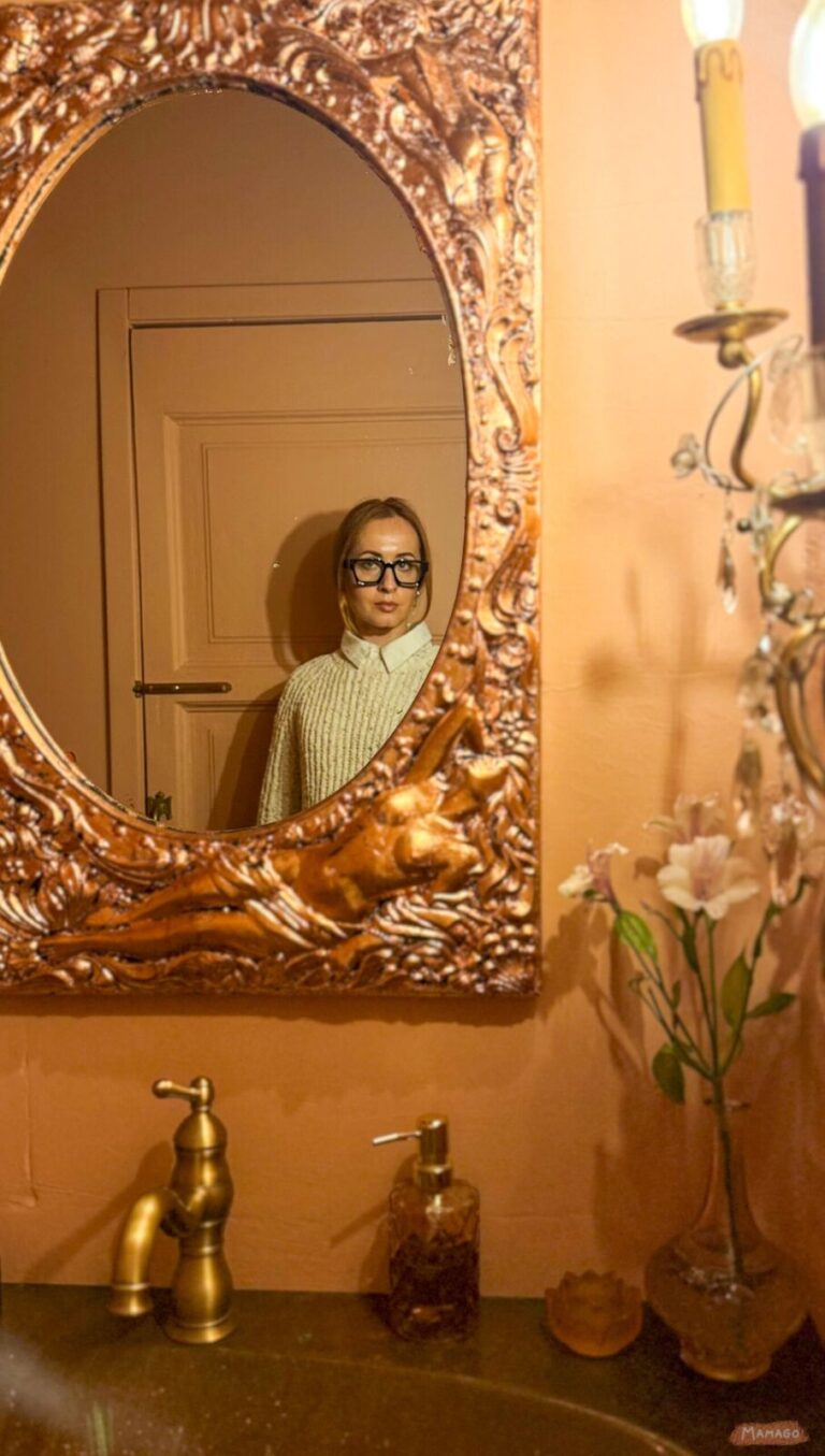 Кафе на 2-х этажах открыла известная блогер Рада Русских. На входе у вас примут заказ (без него наверх никак) и проведут экскурсию по трём залам, уставленным винтажными предметами интерьера, антиквариатом, роскошными вещицами. Ощущение, что попадаешь в музей гедонизма. Мозг моментально расслабляется и выключает мыслемешалку, созерцая красоту и рассматривая каждую деталь: ножки стола в виде сфинкса, хрустальную изумрудную люстру, золотую вышивку на подушке… А «туалетные комнаты» — отдельный вид искусства. Во французском зале множество изысканных аксессуаров и сервиза. В восточном зале проходят чаепития и вход сюда только в нослчках. В румынском зале стены увешаны портретами наших предков «вампиров» и тут же проходят тематические балы гедонистов-вампиров с участием хозяйки Рады.