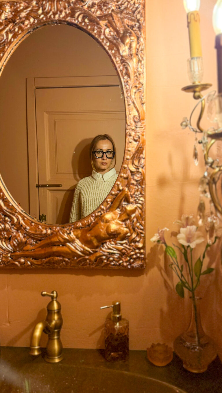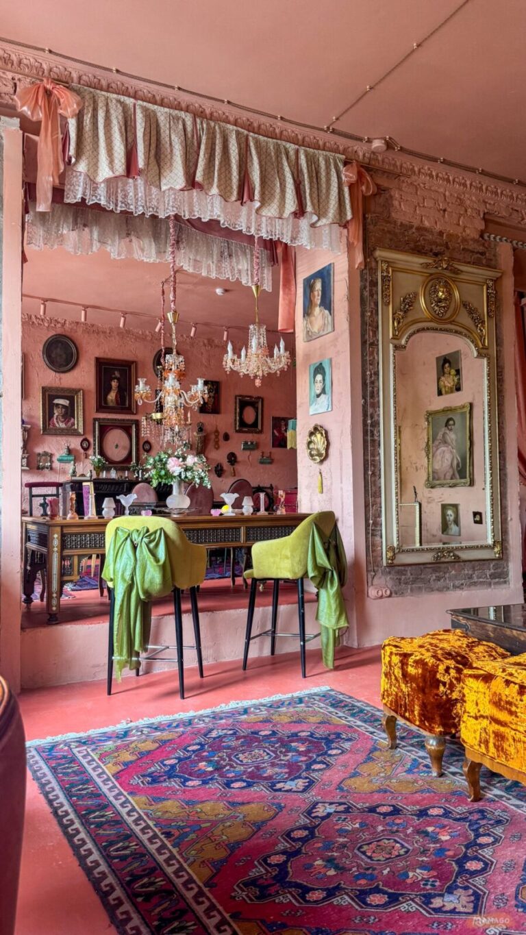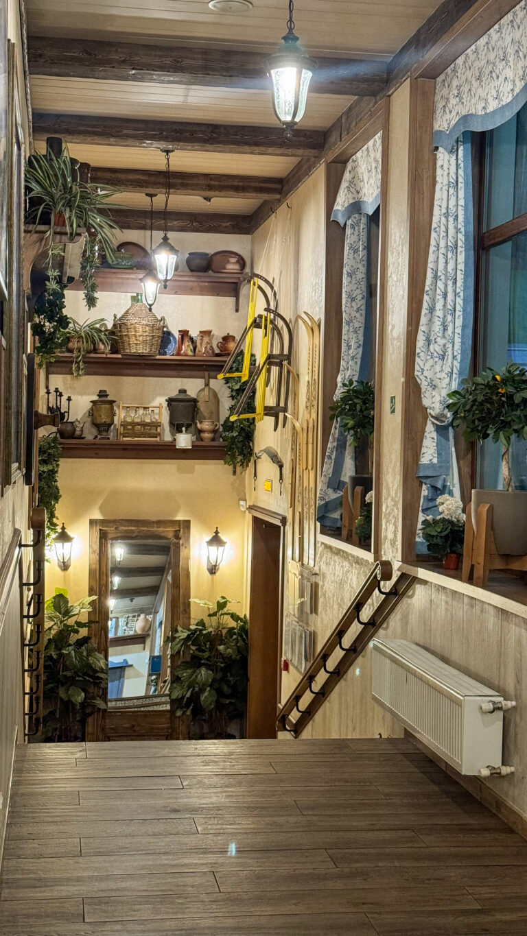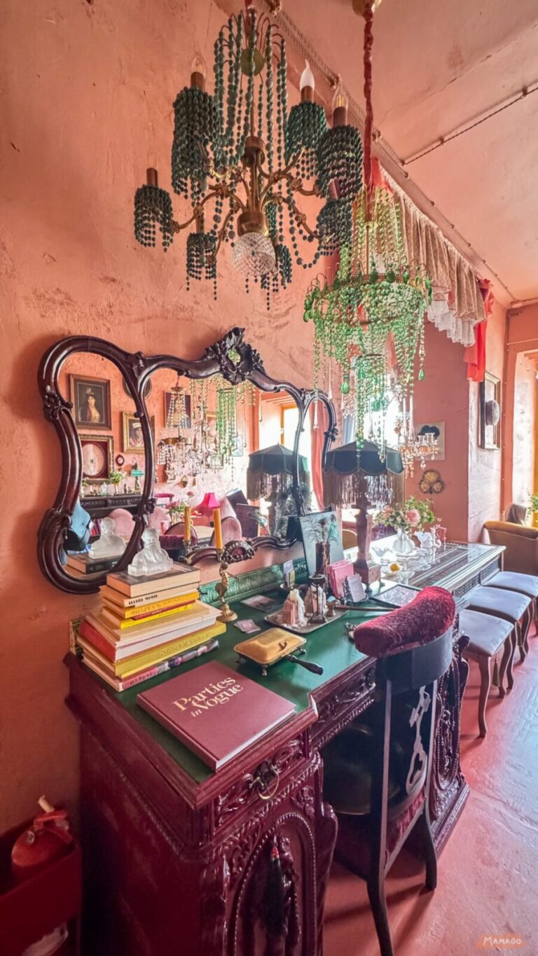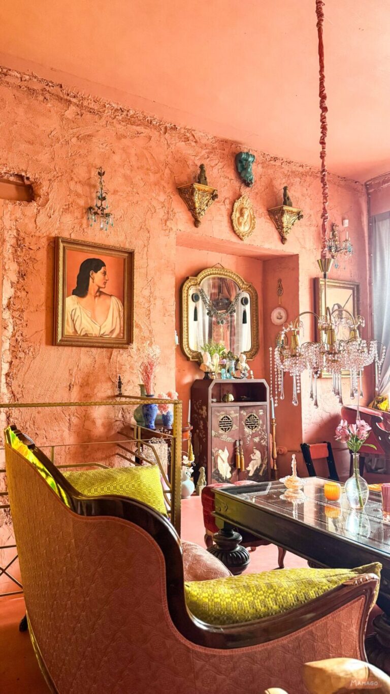 Кафе на 2-х этажах открыла известная блогер Рада Русских. На входе у вас примут заказ (без него наверх никак) и проведут экскурсию по трём залам, уставленным винтажными предметами интерьера, антиквариатом, роскошными вещицами. Ощущение, что попадаешь в музей гедонизма. Мозг моментально расслабляется и выключает мыслемешалку, созерцая красоту и рассматривая каждую деталь: ножки стола в виде сфинкса, хрустальную изумрудную люстру, золотую вышивку на подушке… А «туалетные комнаты» — отдельный вид искусства. Во французском зале множество изысканных аксессуаров и сервиза. В восточном зале проходят чаепития и вход сюда только в нослчках. В румынском зале стены увешаны портретами наших предков «вампиров» и тут же проходят тематические балы гедонистов-вампиров с участием хозяйки Рады.