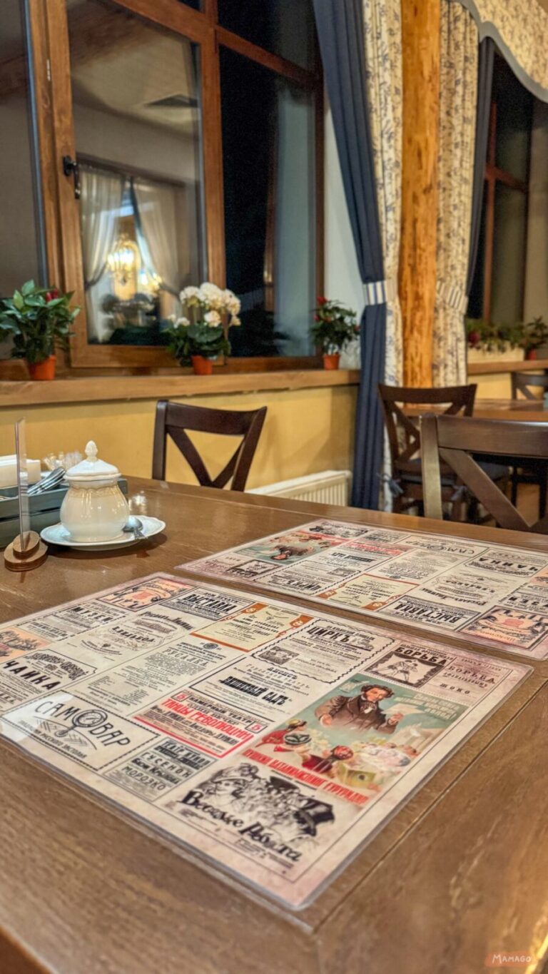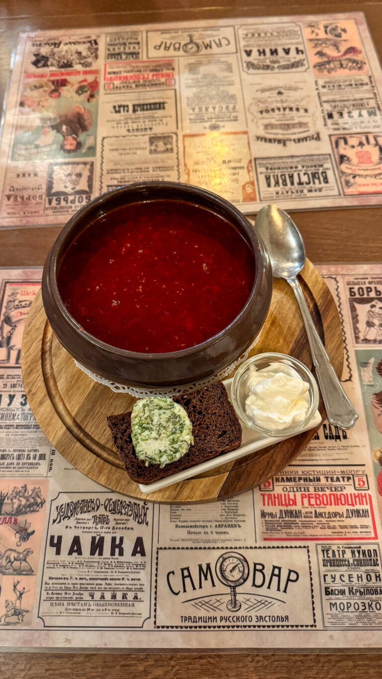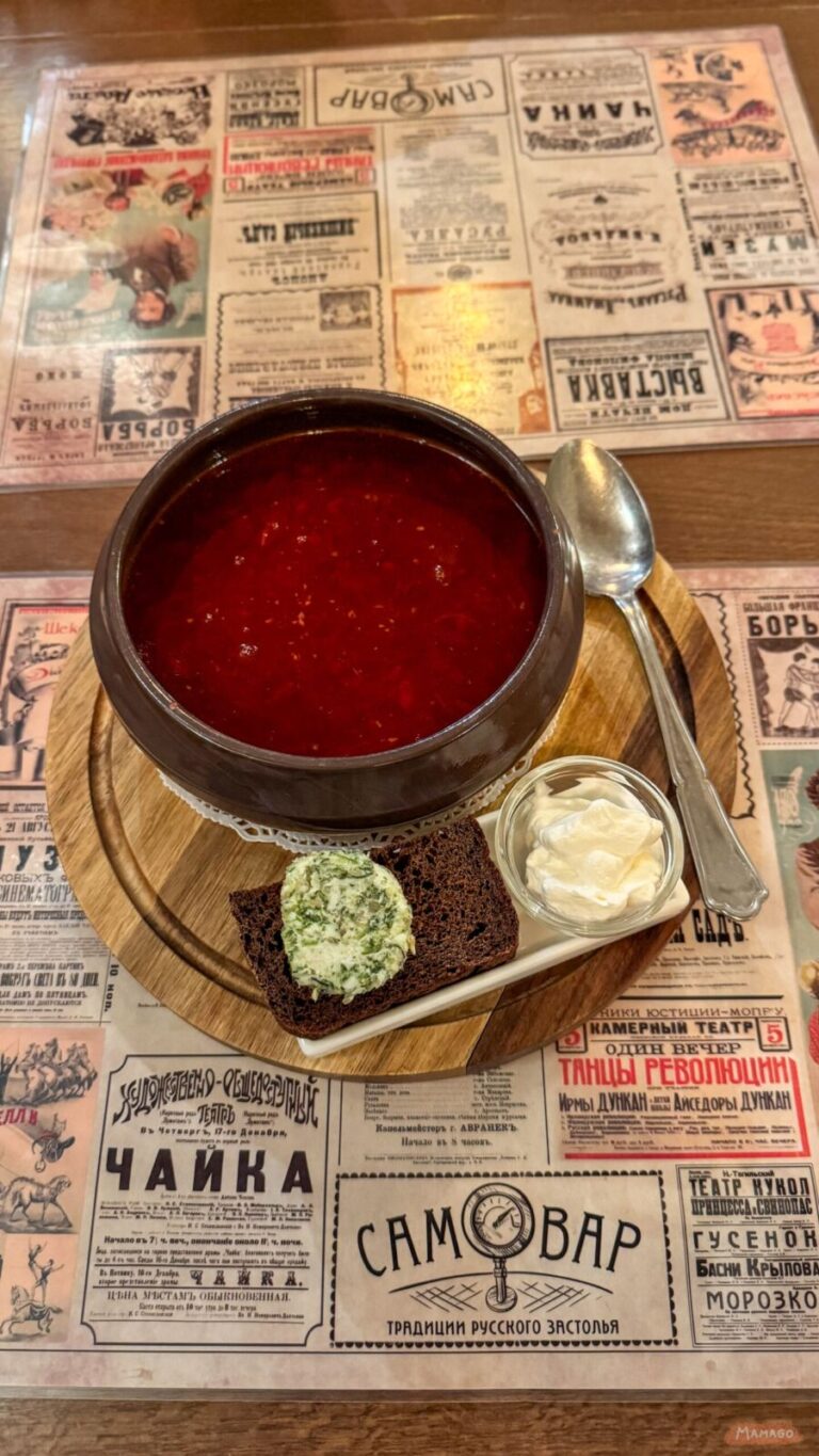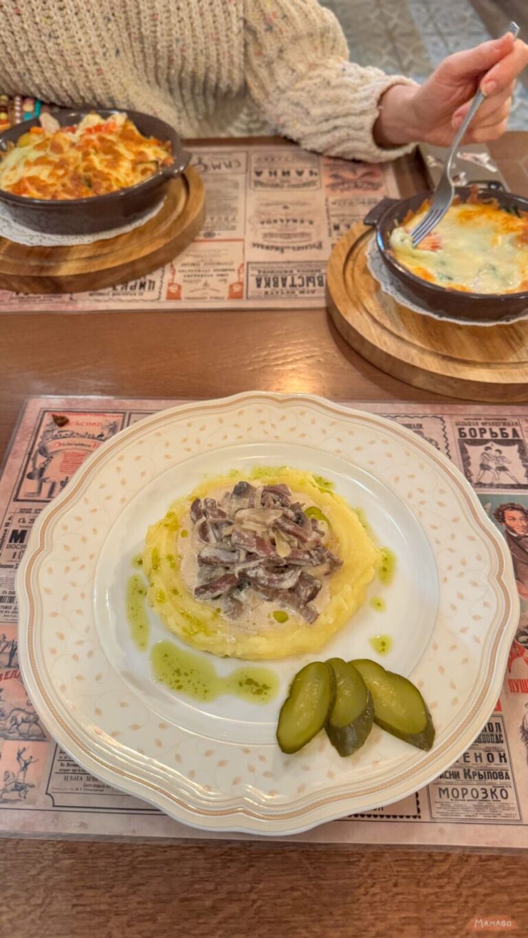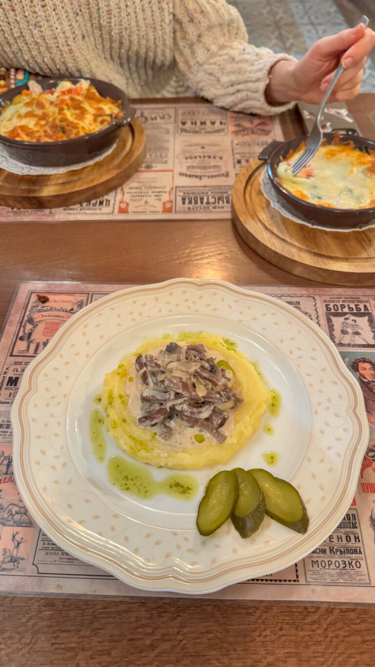 Мы не включили это место на карту маршрута, но обязательно обратите на него внимание, когда поедете в Питер на авто. На обратном пути мы заехали сюда поесть. Тут по-русски атмосферно, вкусно и недорого. Например, борщец 18 руб, а картошечка с сельдью 11 руб.