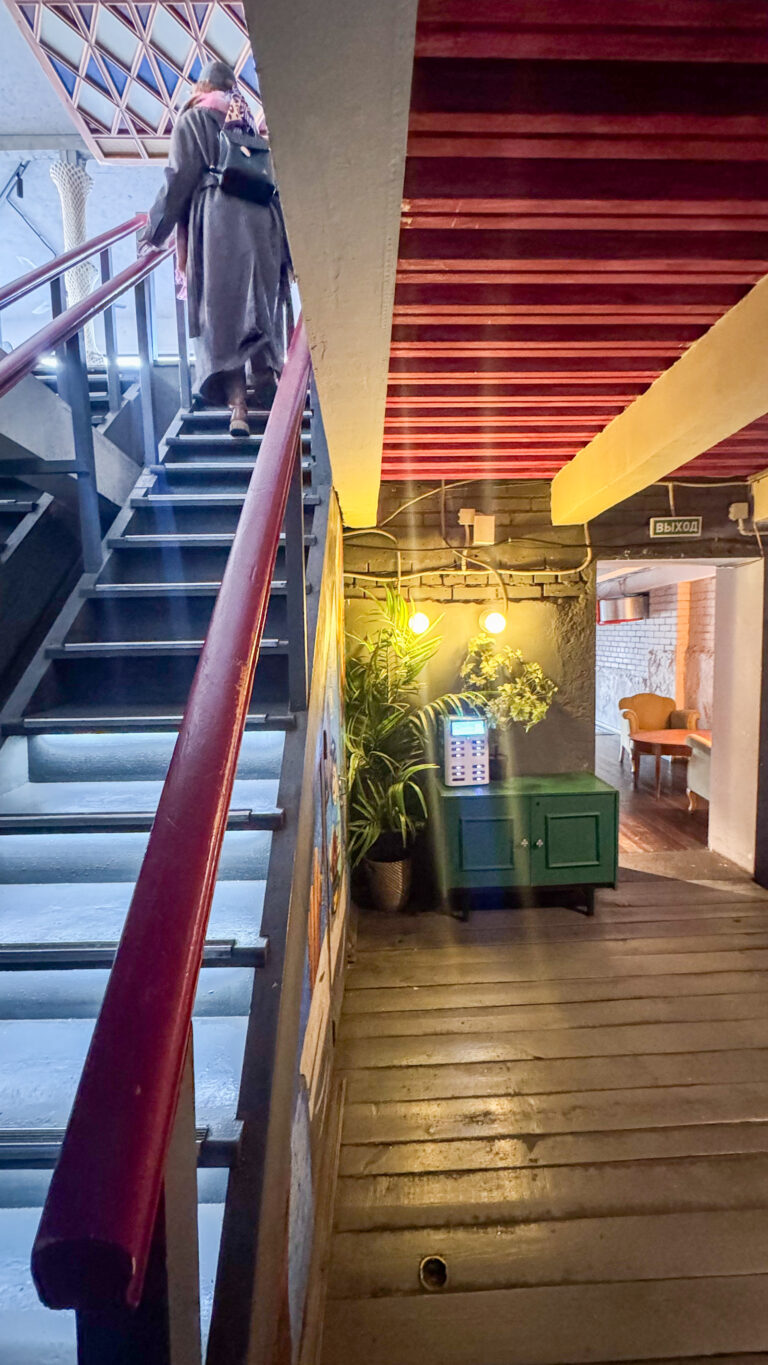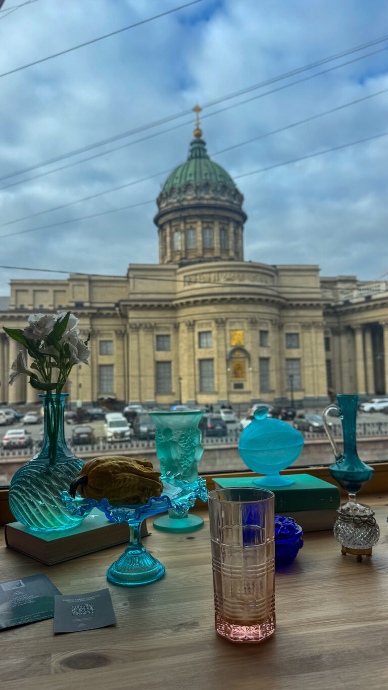 Утром мы не спеша выдвинулись около 11 из «Морошки» прямиком в новое загадочное кафе с видом на Казанский собор. Снова прогулялись по Невскому, обошли собор вокруг, пофоткались и пошли пить кофе в «Гедонист». Сразу предупреждаю: таких цен на капучино вы больше нигде не встретите — 777 рос. руб (30 руб) за порцию на растительном молоке (обычного тут нет). Но считайте это входным билетом в музей.