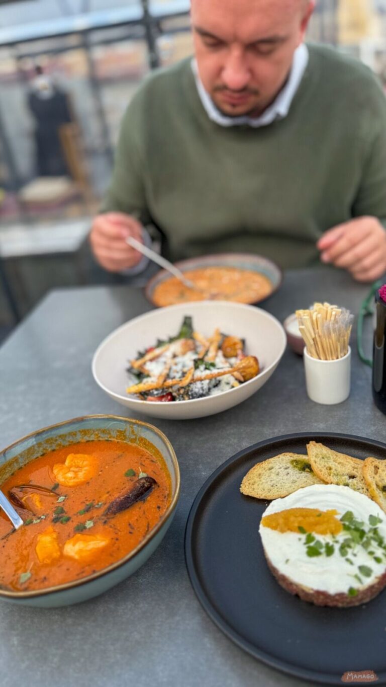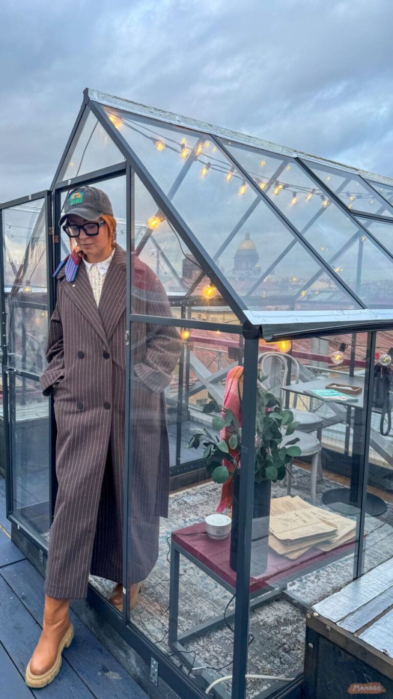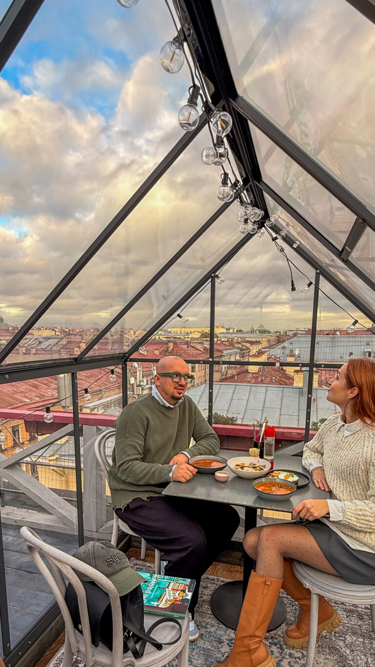 Фишка этого места — оно находится на крыше с невероятными видами на Исаакиевский собор. Можно разместиться в зале, но мы выбрали один из 4 панорамных домиков-теплиц на 2-3 человека. В домике душновато (он отапливается) и тесно, но сам факт ужина на крыше опьяняет! В меню всё прям очень изысканно, куча непонятных слов, но по факту мега вкусно! Мы пробовали опять же любимый тартар (в «Пуси-лебеди» понравился больше, хоть и дешевле в 2 раза), чёрный цезарь с митболлами из креветки, буйабес (суп с морепродуктами), ризотто с тартаром, рассольник. Блюда небольшие, нам хватило. Обязательно бронируйте заранее — вас попросят внести депозит в зависимости от выбранного времени и дня для посещения. Мы оплачивали 3000 рос.руб (114 руб) в понедельник с 15:00 до 17:00 (да, на посещение даётся 2 часа, этого вполне хватает). В итоге мы поели на 4000 рос.руб (150 руб) без напитков.