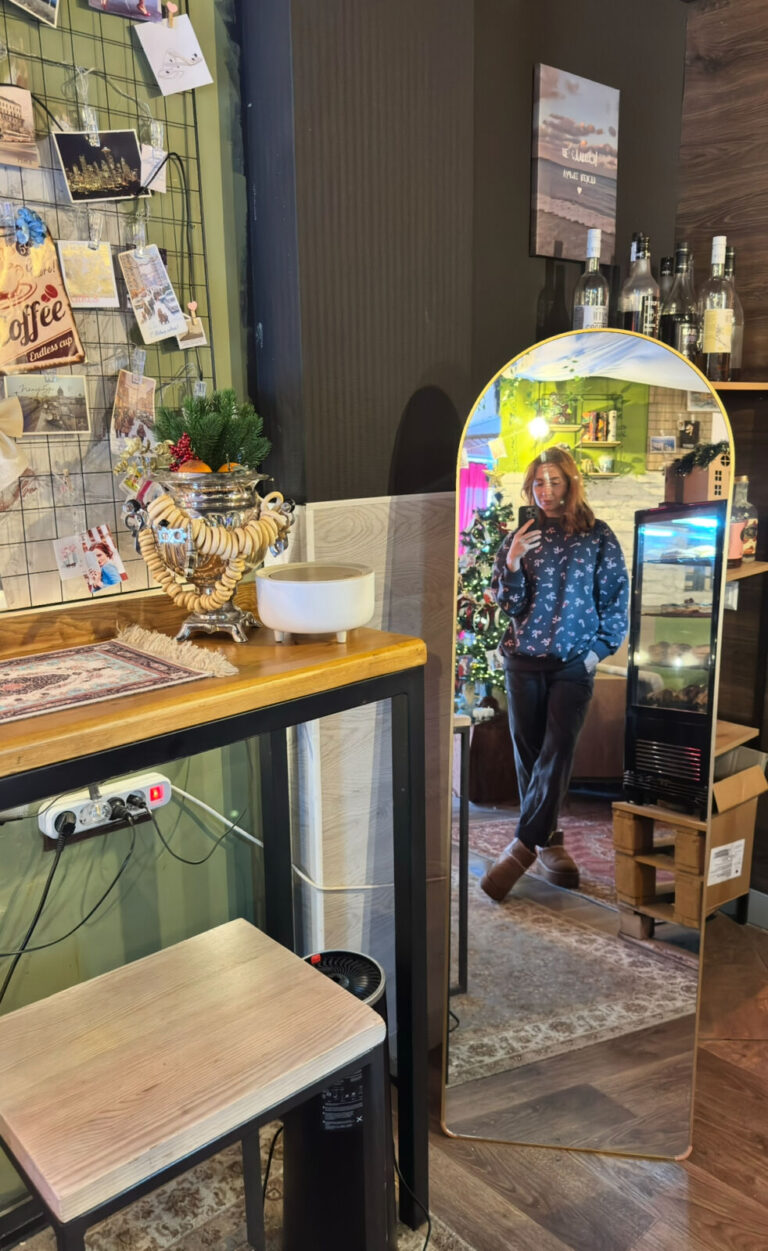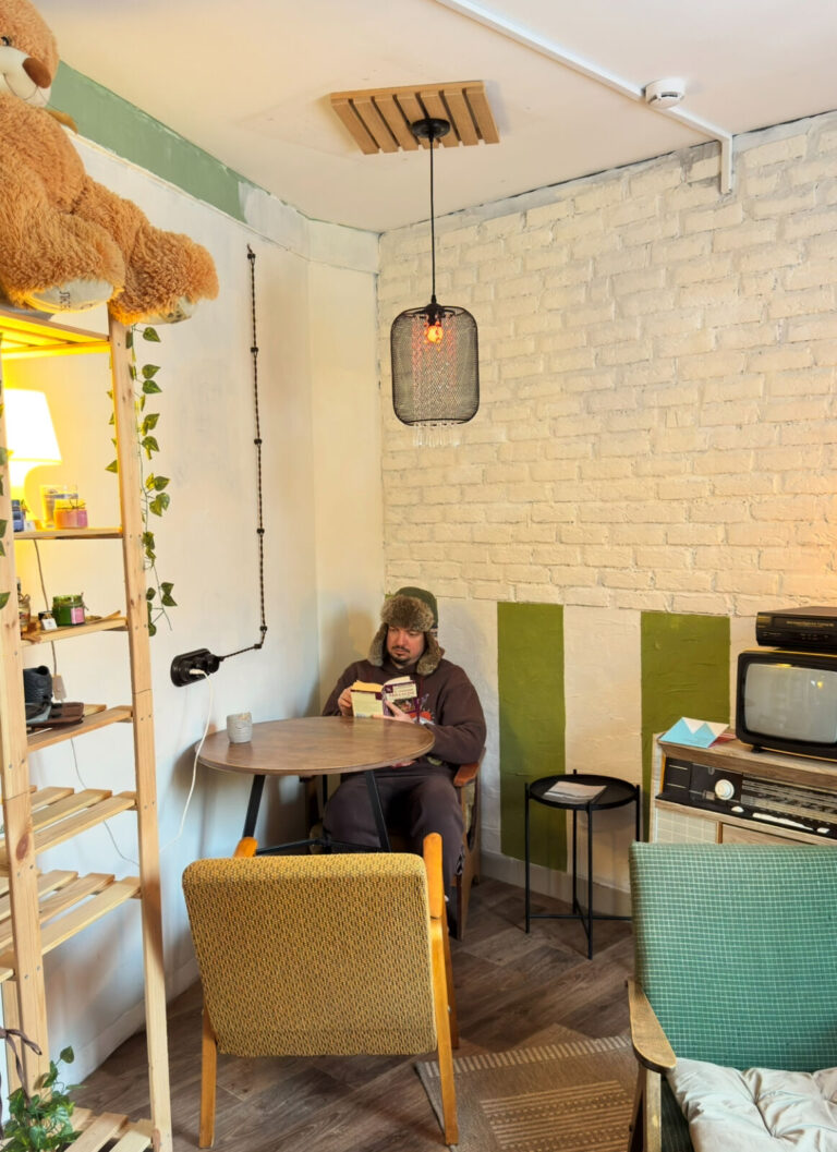 Спрятанное, но такое душевное место 🤍 Людей мало — и в этом весь кайф. Будто зашла в гости к друзьям: советские ковры, ламповый телевизор, кассеты, лего, винтажные кресла и очень уютный дворик. Скоро, кстати, откроют ещё один зал для мероприятий ✨