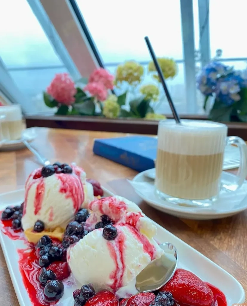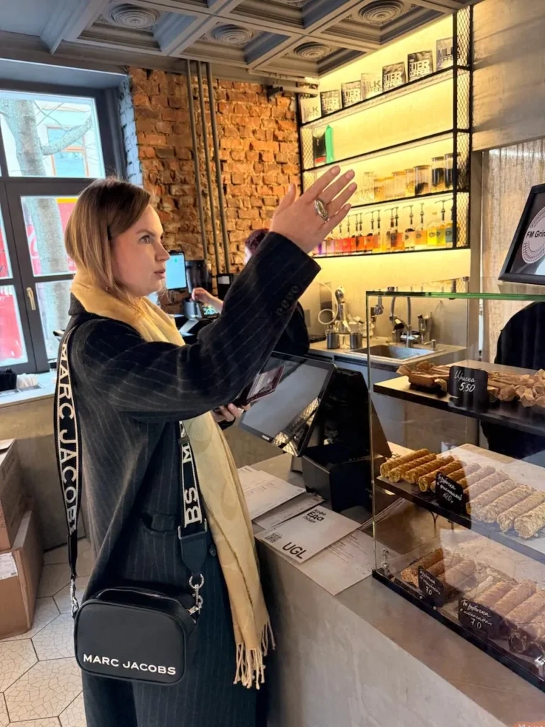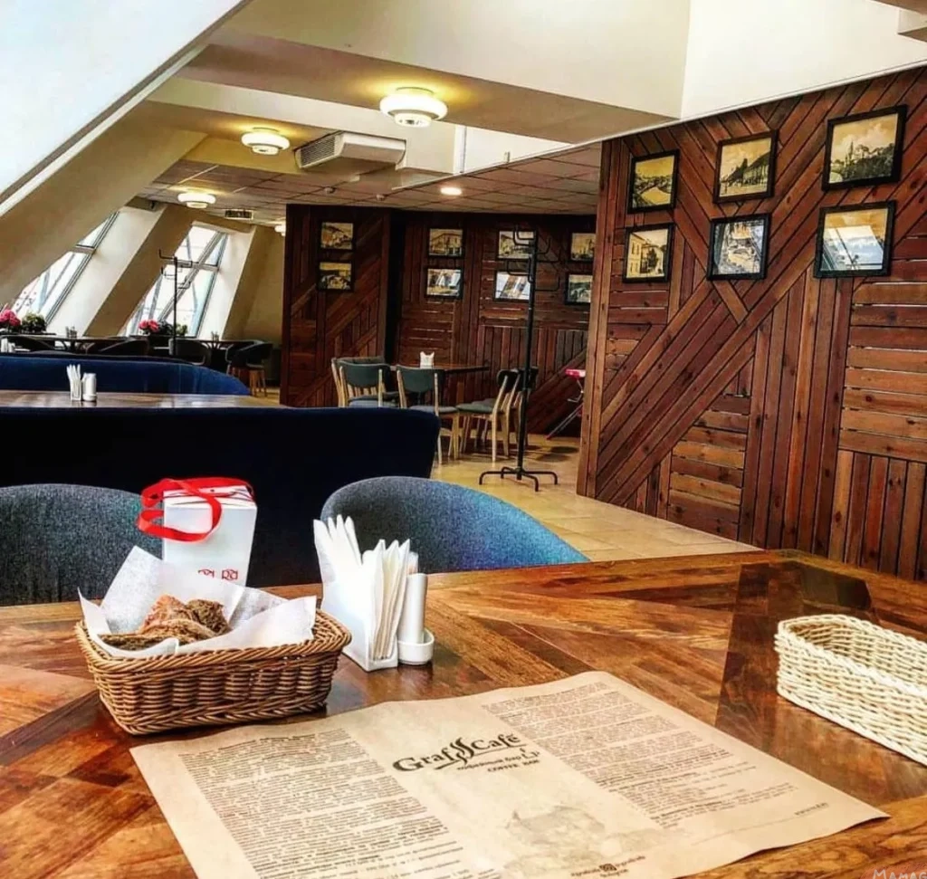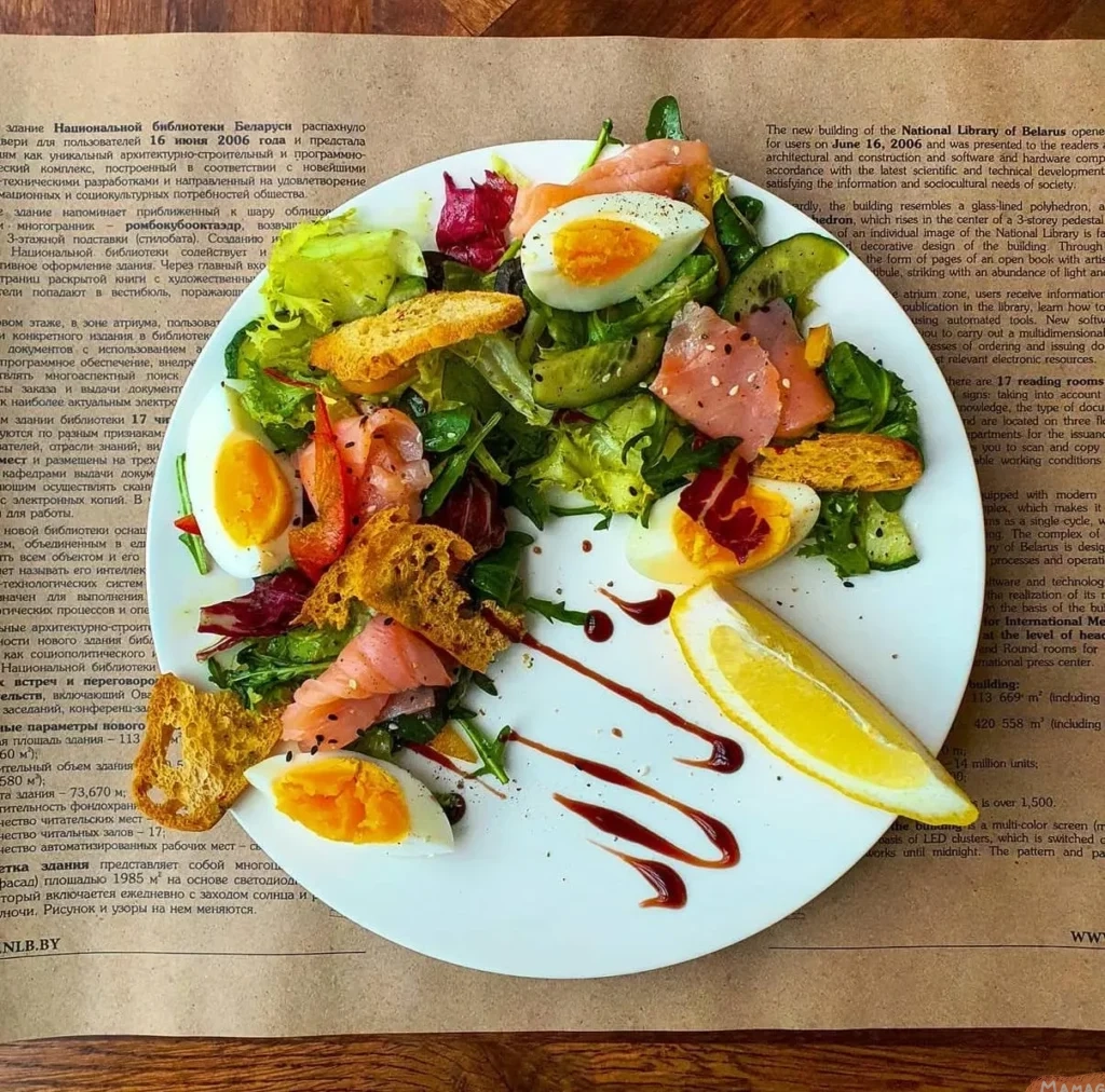 Приобретаем билеты на смотровую площадку Национальной библиотеки и наслаждаемся вкусным кофе и обедом в кафе «Граф». Вид тут с 22-го этажа невероятный! В меню салаты, различные драники, наггетсы с фри, десерты.